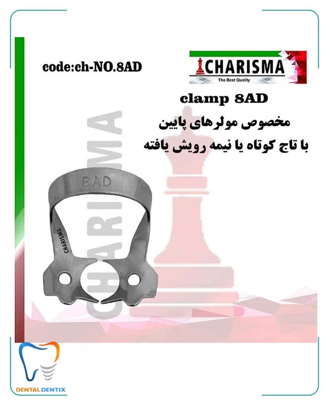 کلمپ 8AD مخصوص دندانهای مولر (آسیای بزرگ) است، بهویژه برای مولرهای پایین (Mandibular Molars) که تاج کوتاهتر و دسترسی سختتری دارند